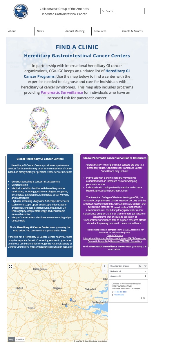 The Collaborative Group of the Americas – Inherited Gastrointestinal Cancer has a ‘Find a Clinic’ tool that allows patients/medical providers to search for specialised hereditary cancer centres afilliated with members of CGA, InSiGHT, the European Hereditary Tumour Group and the Latin America-Grupo de Estudios de Tumores Hereditarios. The tool can be accessed here .